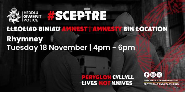 Monday 17th November is the start of Sceptre - a nationwide awareness week to tackle knife crime and serious violence. As part of Sceptre, Gwent Police is joining services across the country to carry out seven days of anti-knife crime work, and education in schools, to highlight the devastating impact of knife crime.