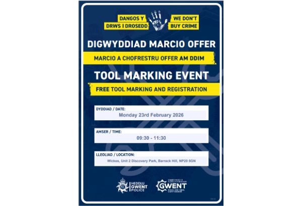 The Bettws Neighbourhood Policing Team will be working with the We Don’t Buy Crime (WDBC) Team at a tool marking event at Wicks, Unit 2, Discovery Park, Barrack Hill, NP20 5GN on Monday 23rd February at 9:30am.