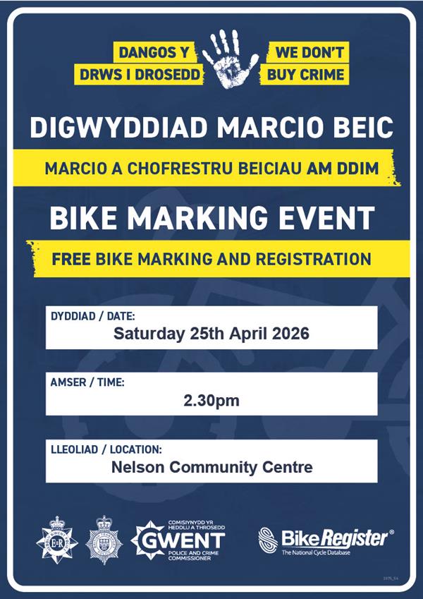 Caerphilly North Neighbourhood Team are teaming up with Nelson Councillors to help keep your bike safe and reduce theft in our communities. Join us for a FREE bike marking event, where Local Neighbourhood Teams will securely mark your bicycle and register it - making it easier to return to you if it's ever lost or stolen.